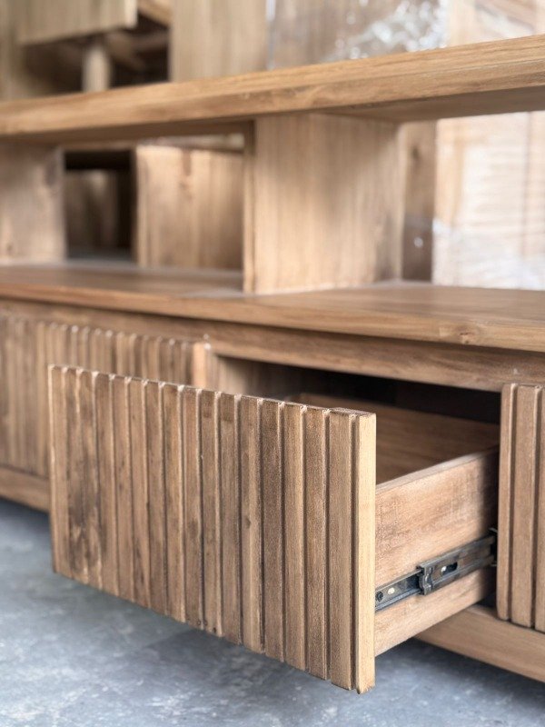 Añade estilo y funcionalidad a tu sala de estar con el Rack Lujan con cajones varillados. Disfruta de su diseño elegante y aprovecha al máximo su capacidad de almacenamiento y su espacio ideal para tu televisión.