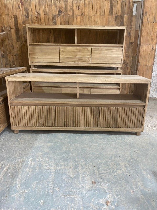 Construido con materiales de alta calidad, el Rack Lujan está diseñado para ser duradero y resistente. Puedes elegir entre mantenerlo en su acabado natural de álamo crudo, listo para que puedas personalizarlo según tus preferencias, o con un lustre similar al petiribi que realza la belleza natural de la madera.